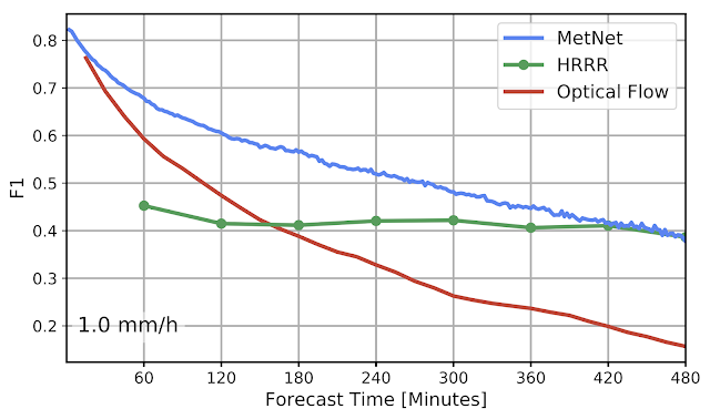 The results seem very promising as they are able to outperform both a classical NWP model (=numerical weather prediction using physics) and an optical flow approach up to eight hours into the future. I’m very glad Google is funding this research and consider this work an important achievement. But I also have some qualms about the way the MetNet forecasts were evaluated: